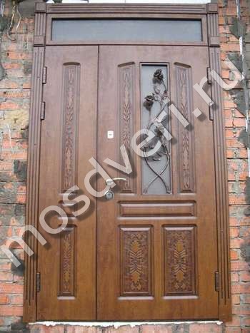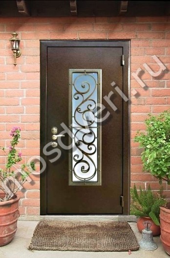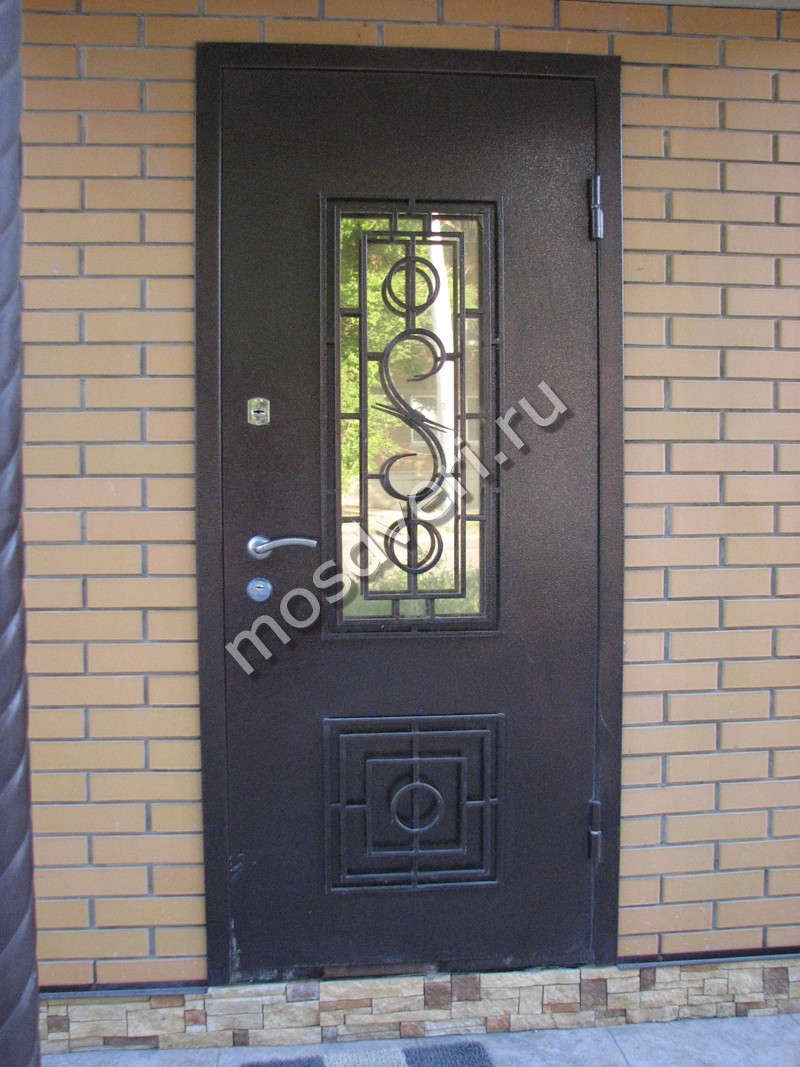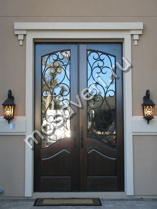 Вставки уличных входных дверей со стеклом защищены железной декоративной ковкой или литьем в виде художественной решетки.